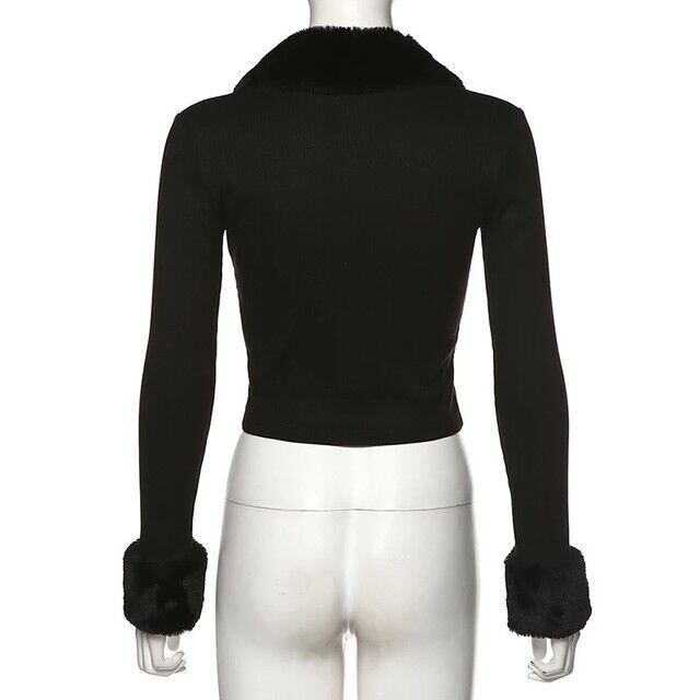V字ネック ファー付き ボタンダウン クロップトップ セクシー ロングスリーブ リブニット スタイリッシュ ストリート 送料無料 プチプラ 海外 インポート カジュアル 海外セレブ風 レディースファッション パーティー クラブ フェス ダンサー 衣装
